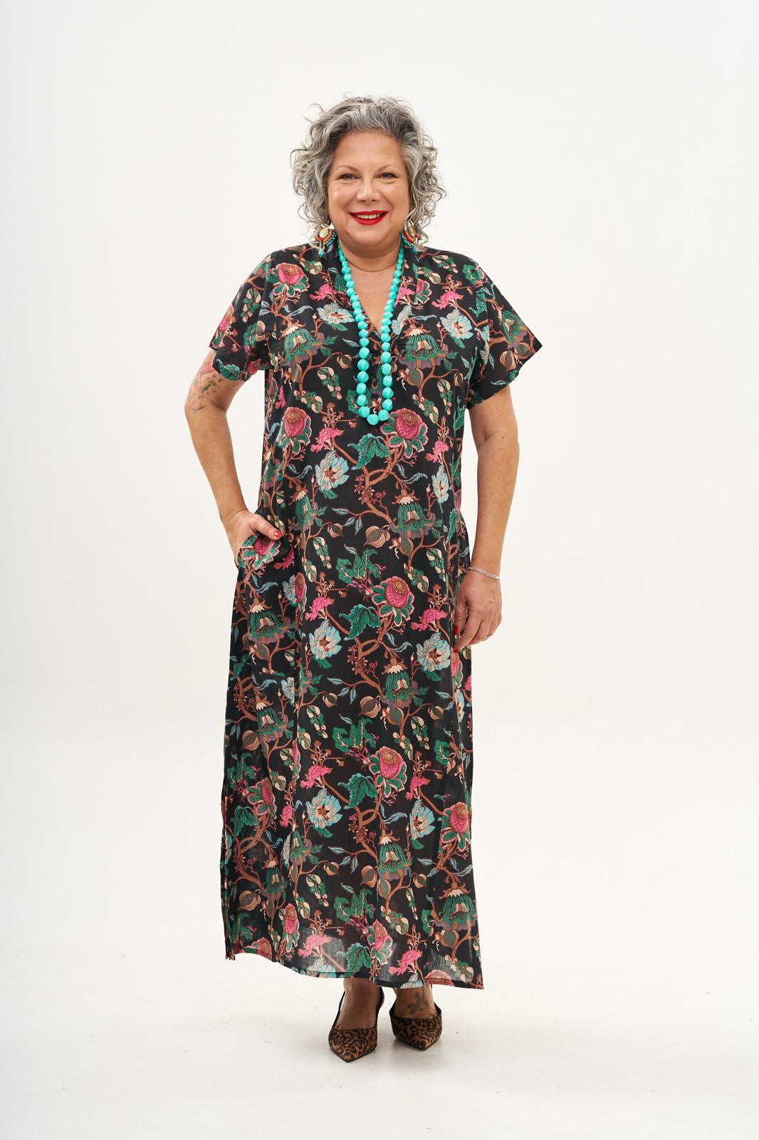 פירוט צבע: פרינט פלורה שחורה, שמלה בצבע שחור עם הדפס פרחוני צבעוני.