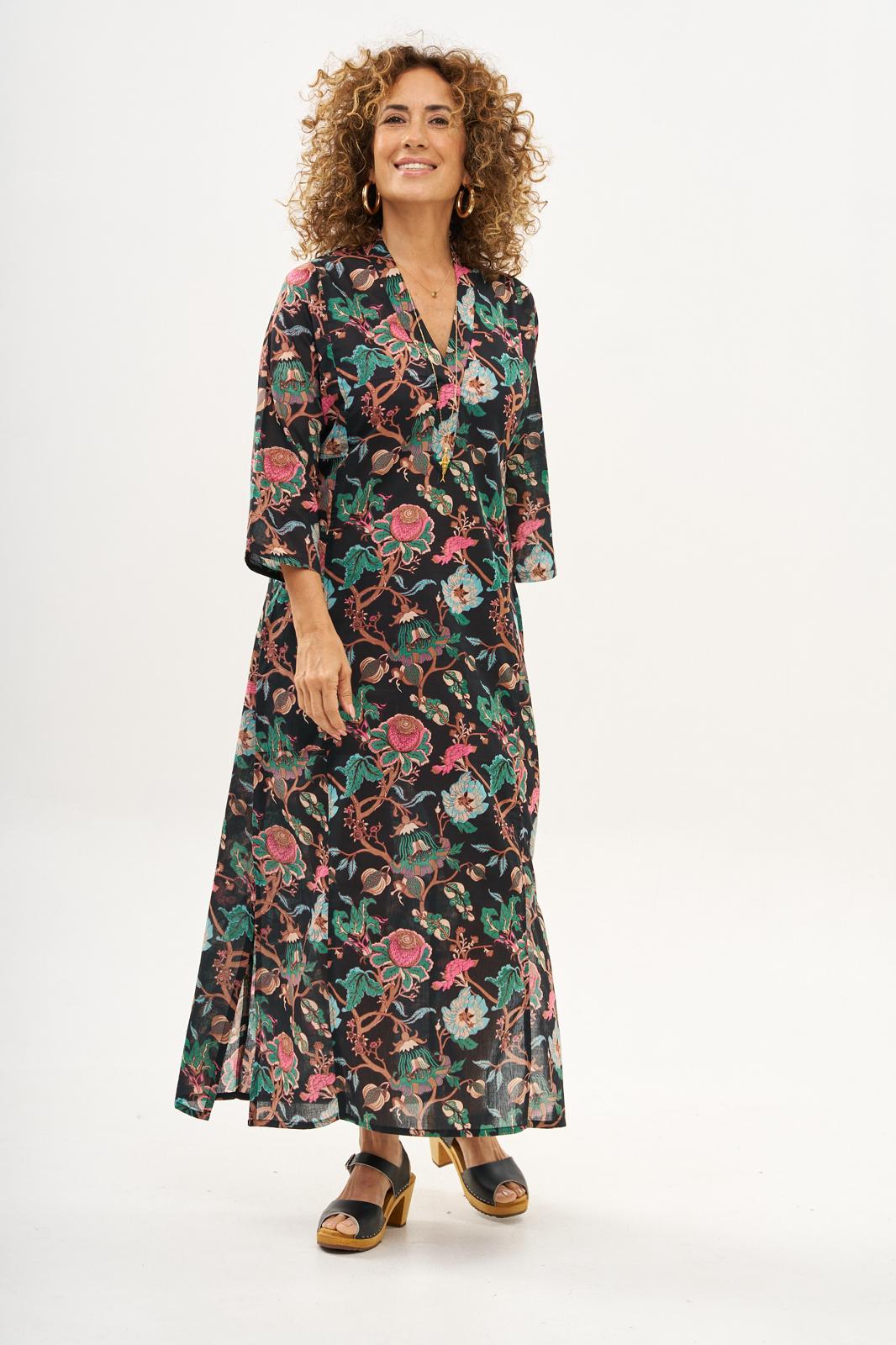 פירוט צבע: פרינט פלורה שחור, שמלה בצבע שחור עם פרינט פרחוני צבעוני.