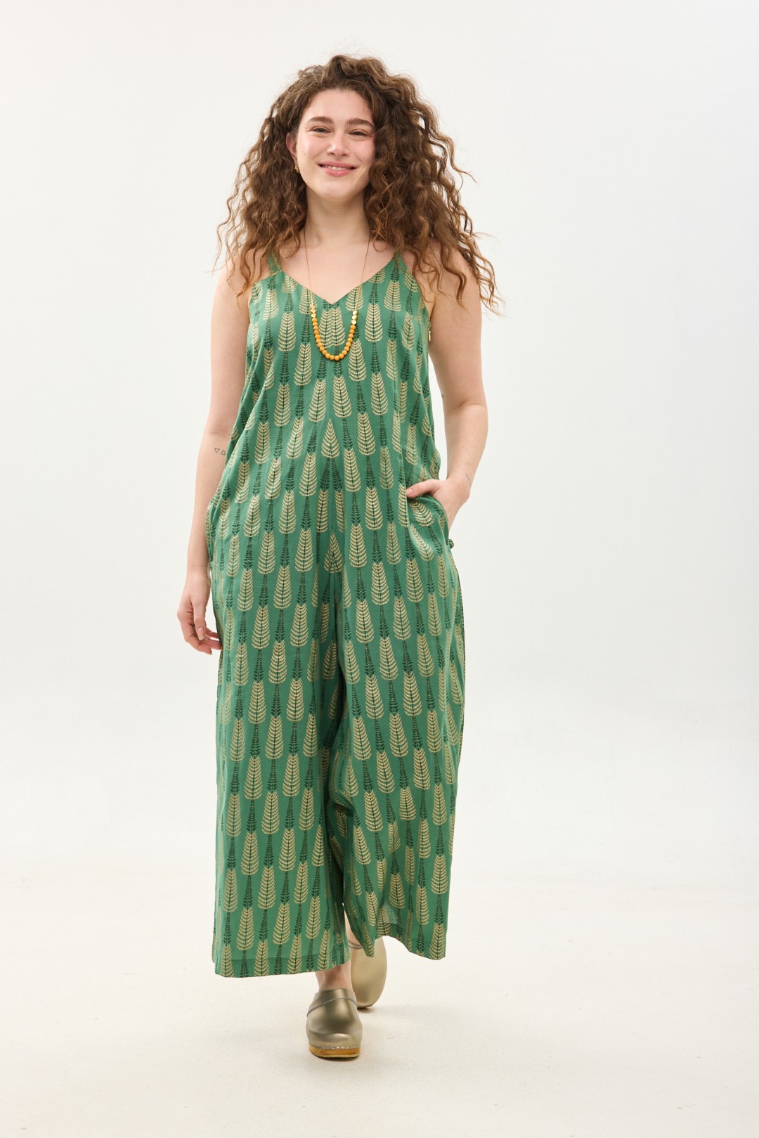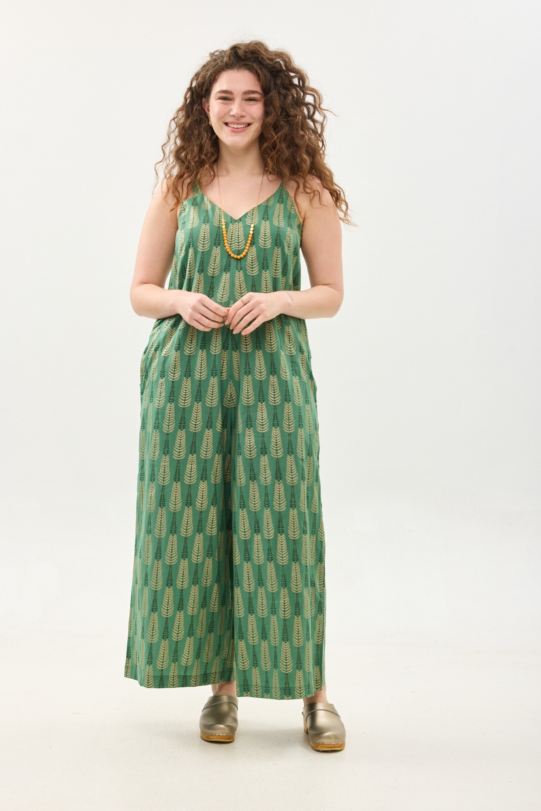אוברול גופיה אוברסייז נוח ומחמיא באורך הקרסול, עם כתפיות דקות, מפתח וי רחב וכיסים.