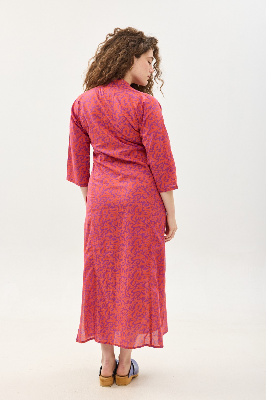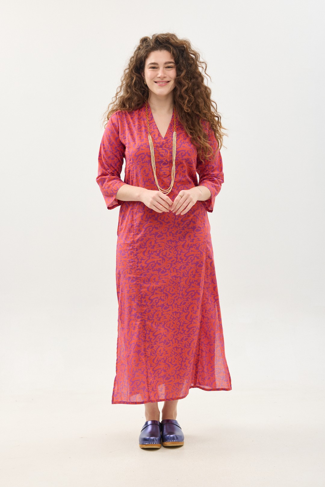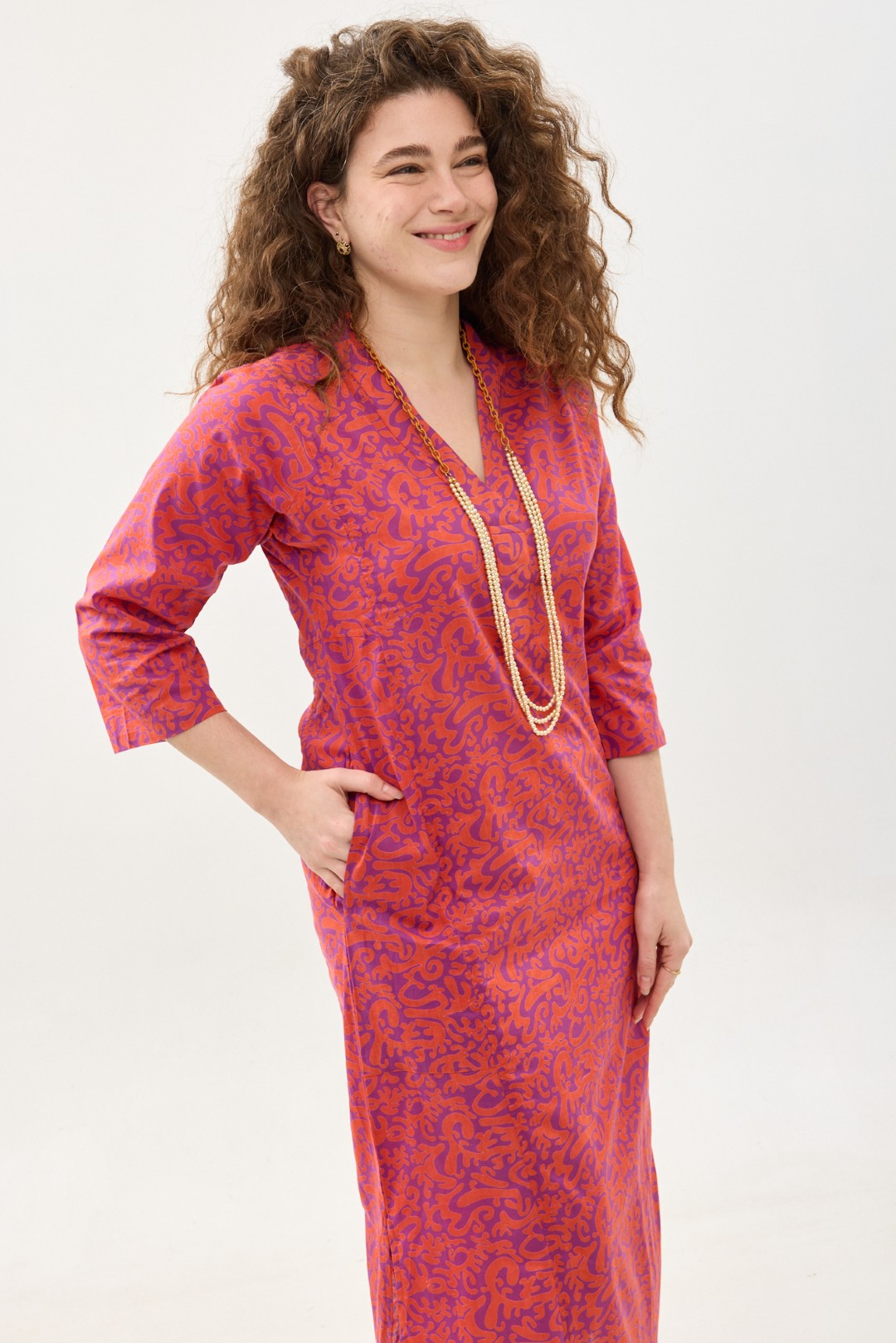 שמלת גלביה נעימה ונוחה באורך הקרסול, צווארון ווי, שרוולים 3/4 וכיסים צדדיים.
