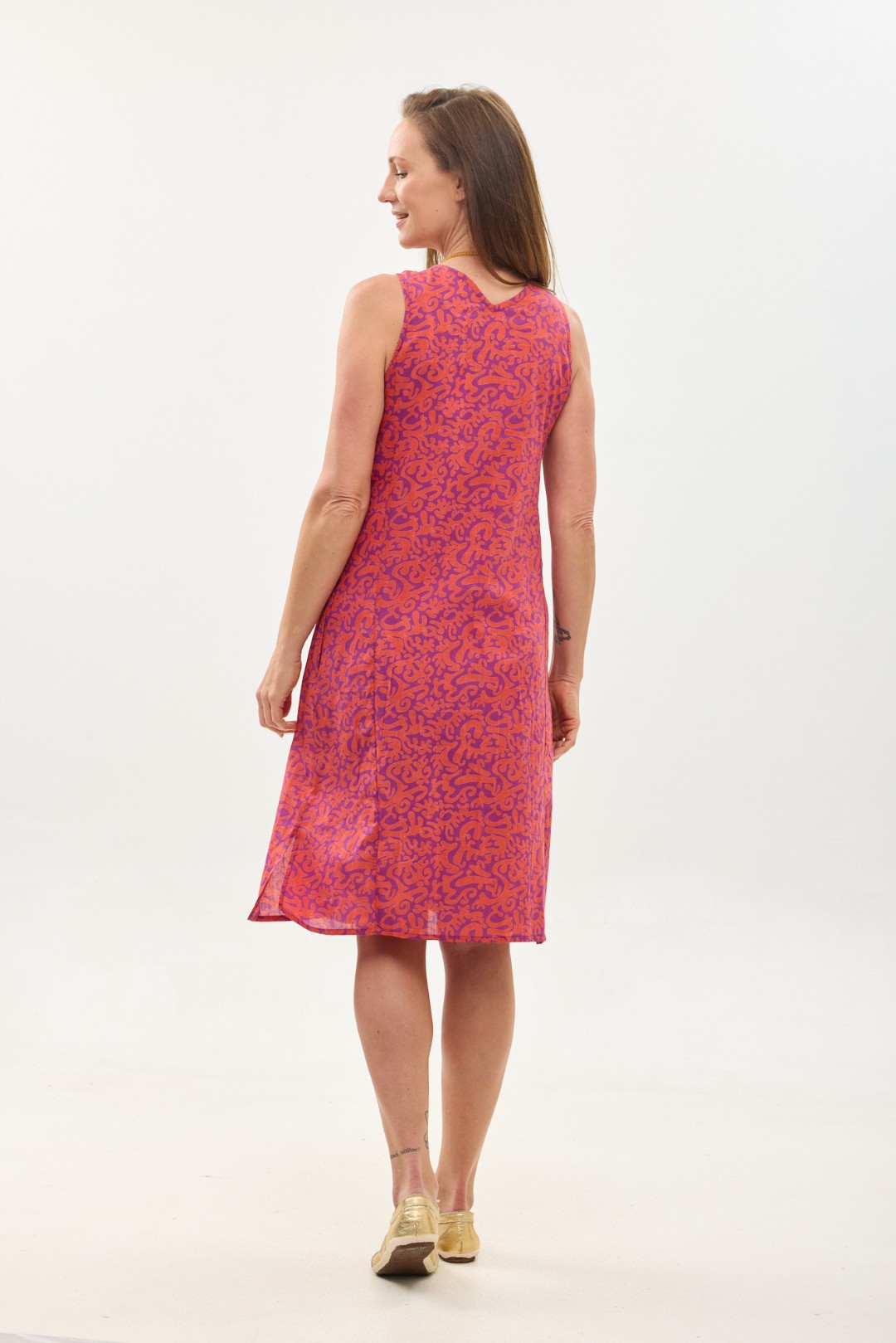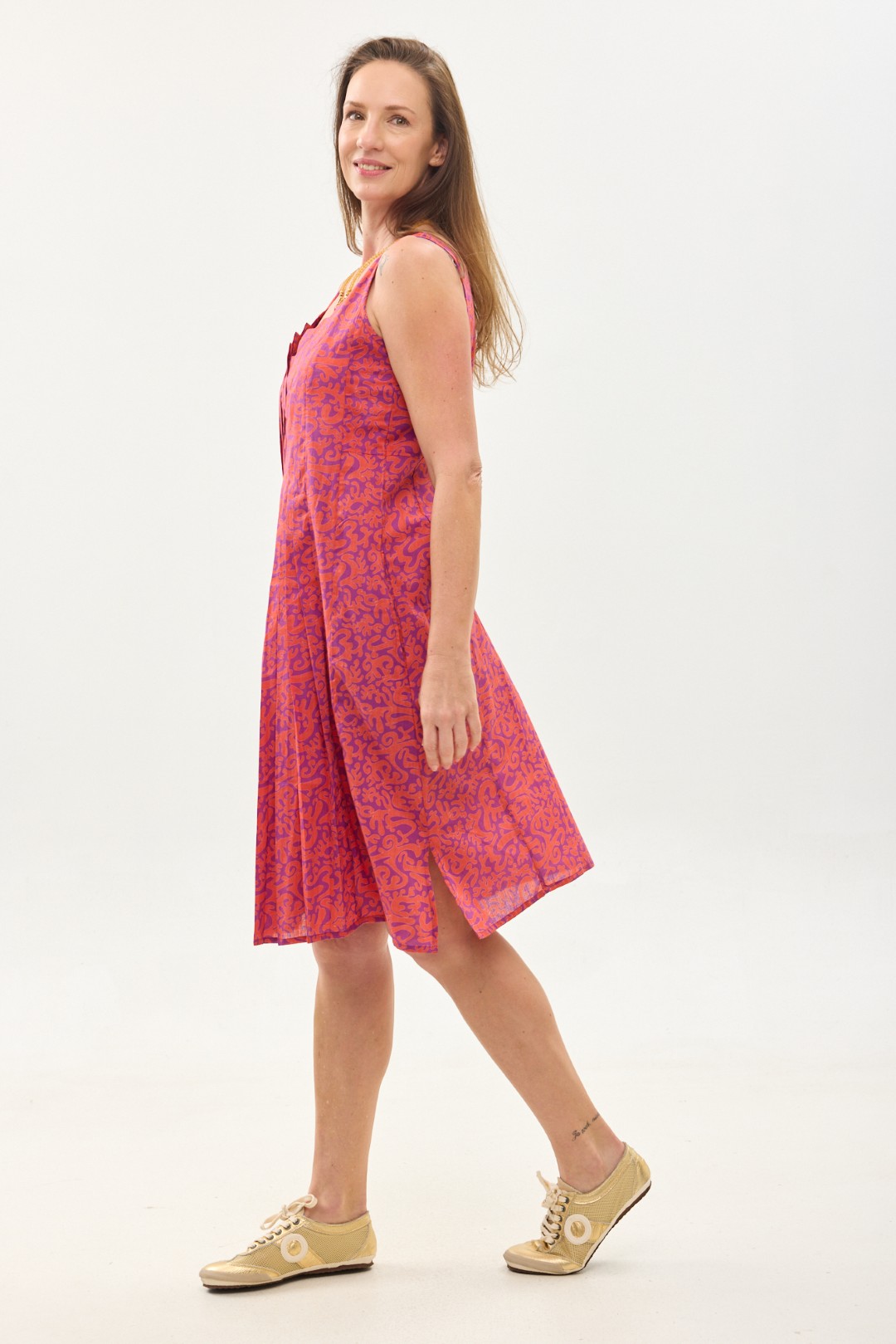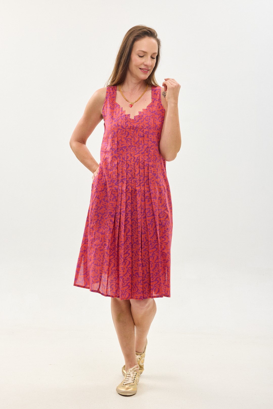 שמלת היידי, שמלת גופיה נוחה ומחמיאה באורך מתחת הברך, עם כתפיות רחבות, מפתח גאומטרי ואלמנט פליסה בחזית למראה מתוחכם.