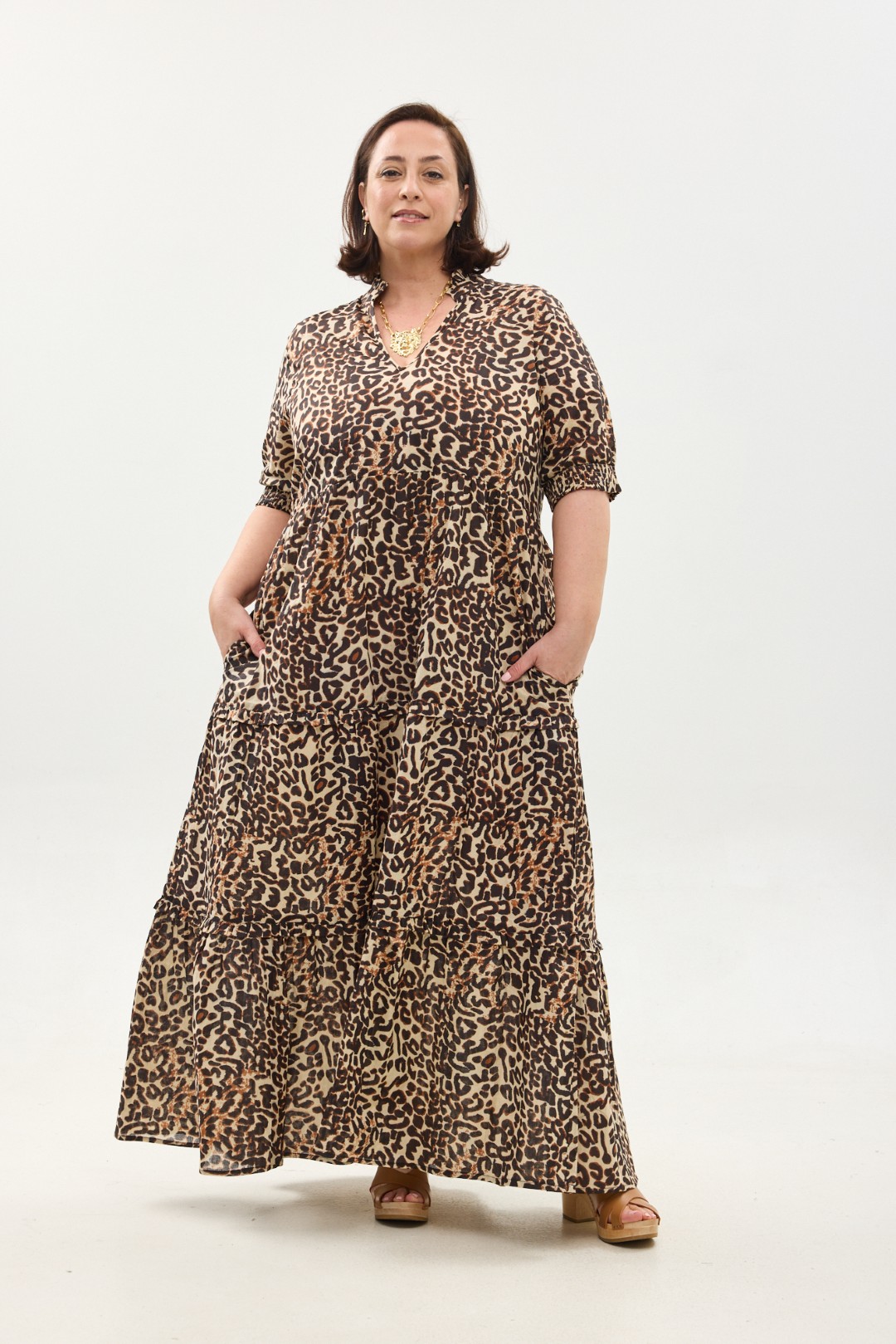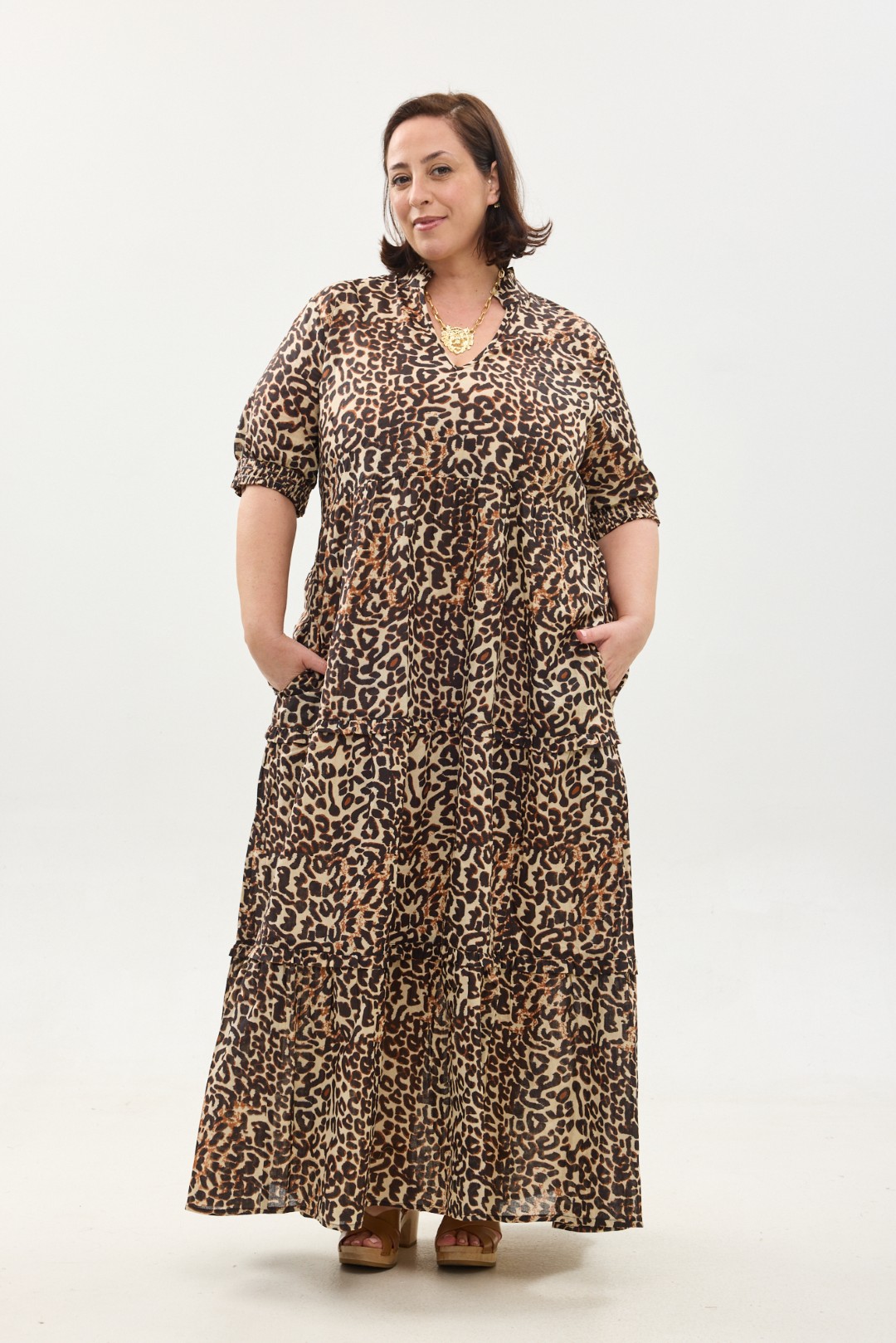 שמלת אפרת, שמלת מקסי קומות נוחה ומחמיאה, עם צווארון וי משודרג, שרוולים באורך המרפק עם גומי וכיסים.